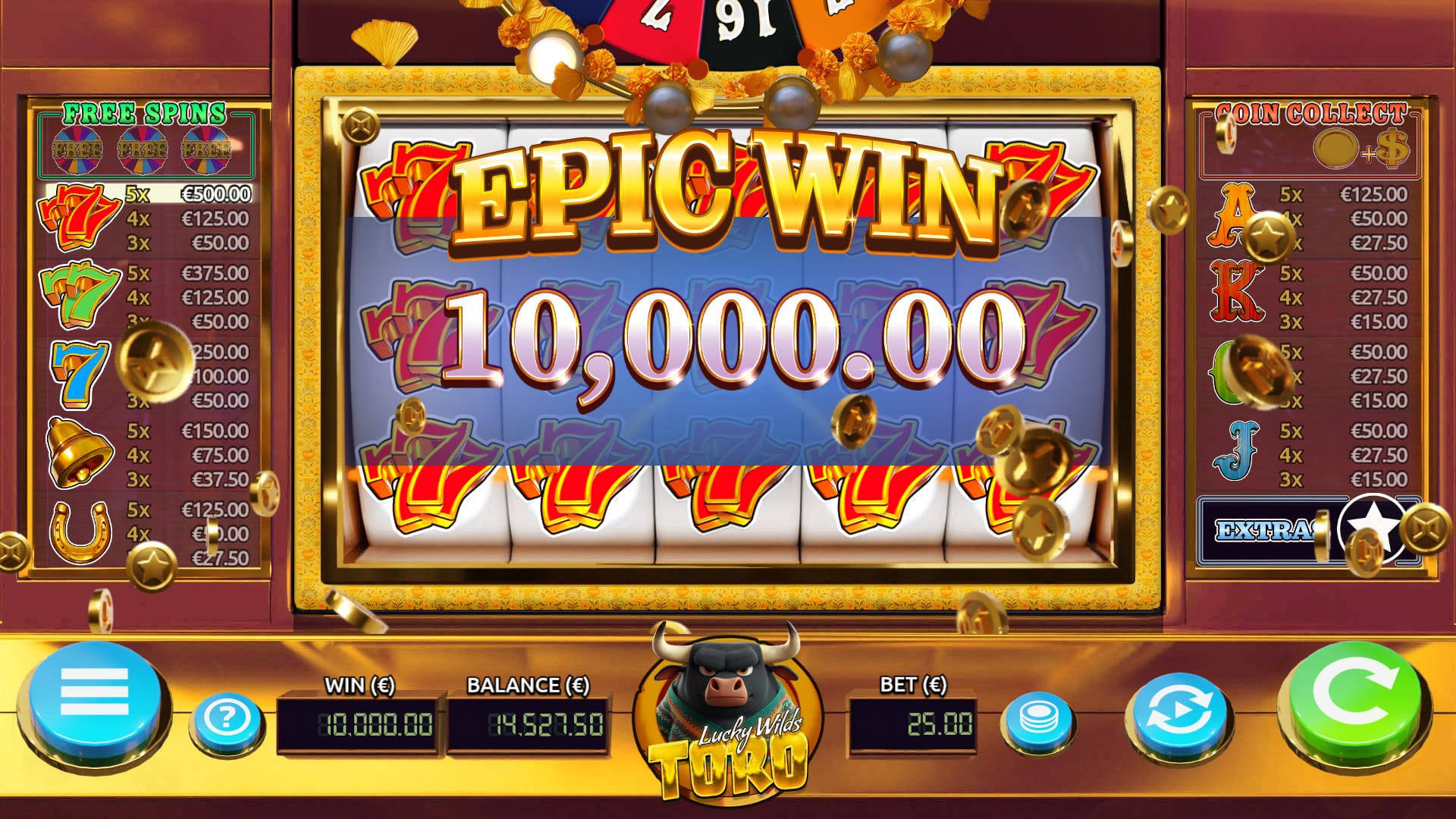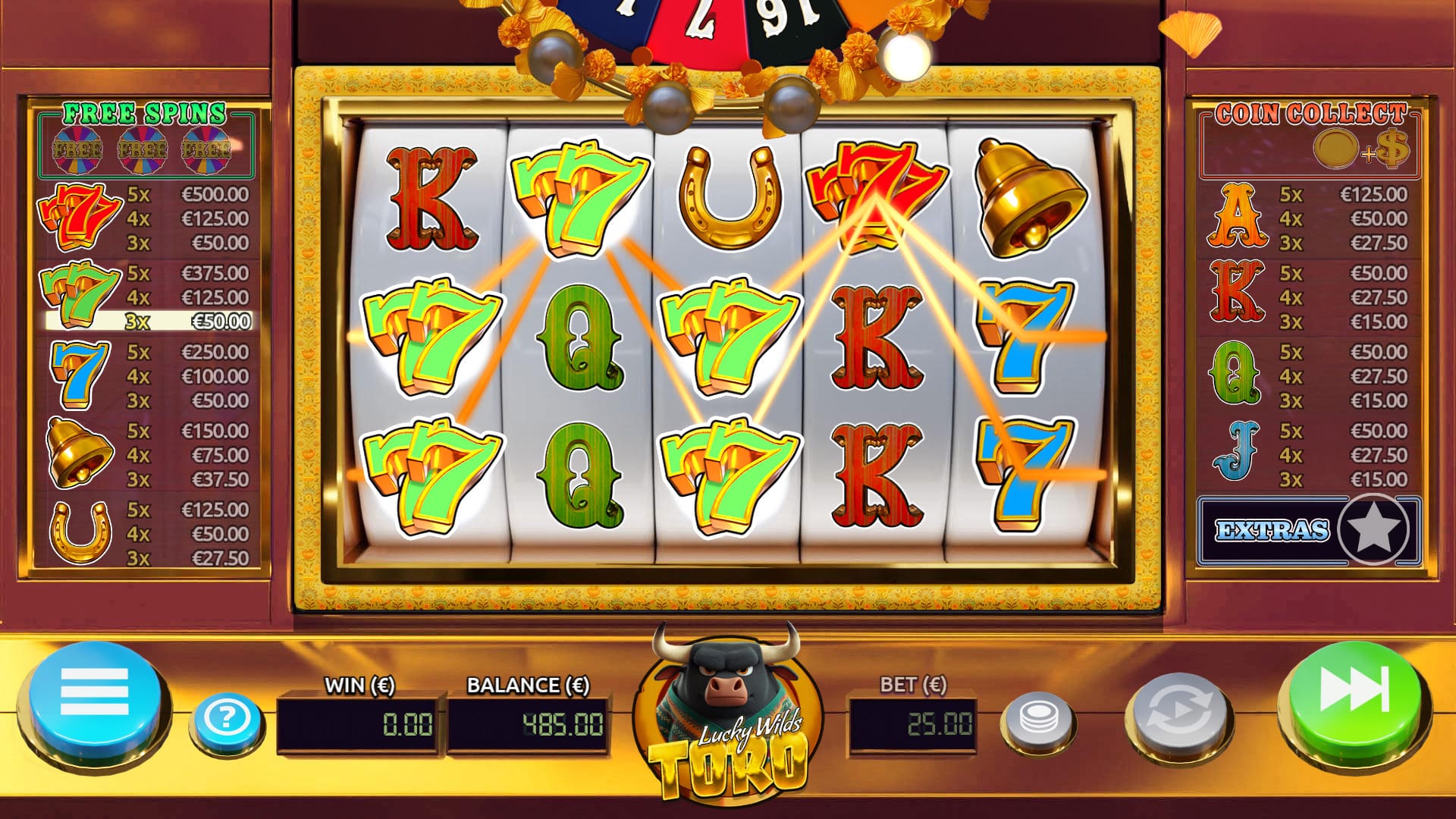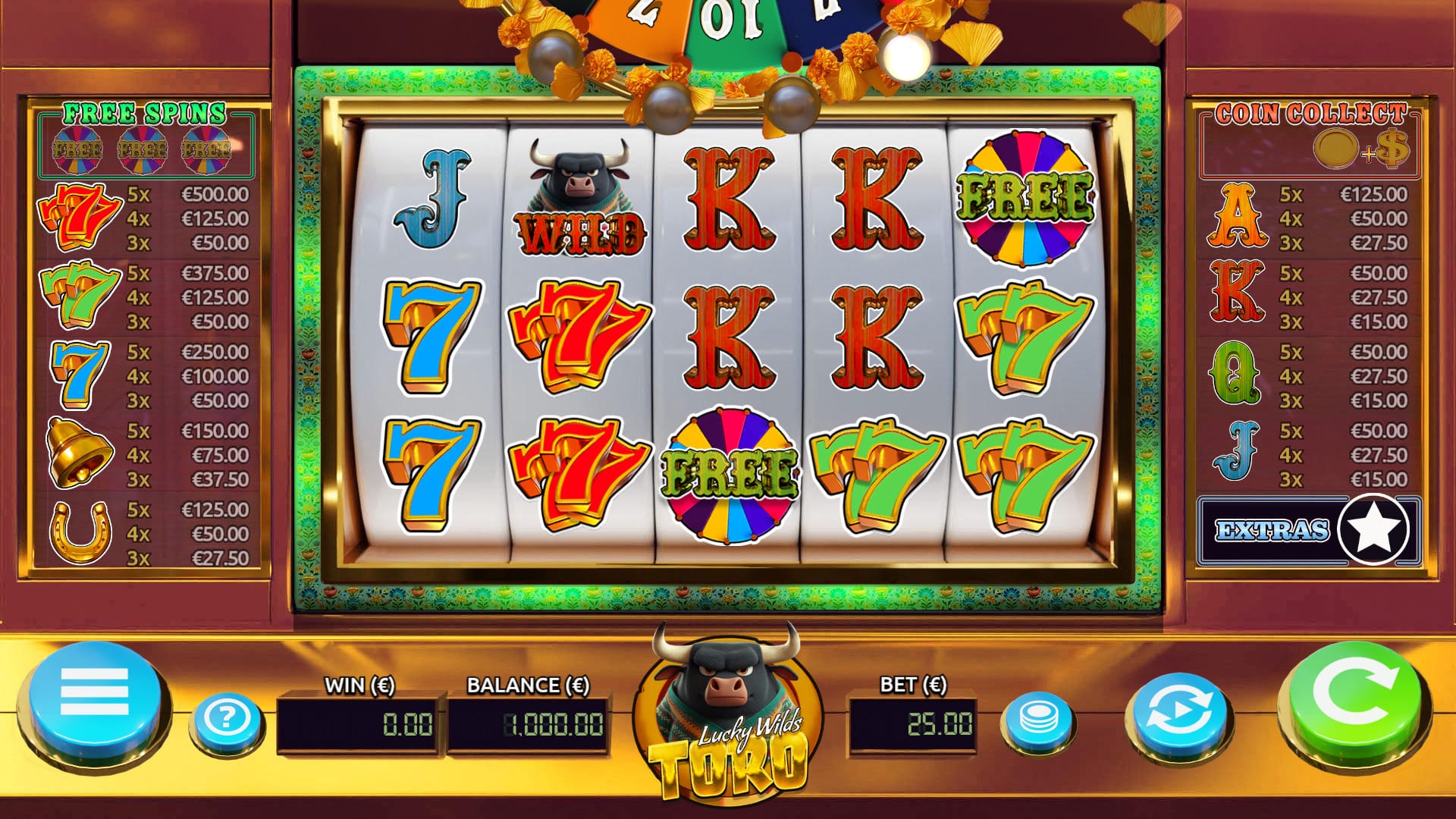 Dice Crafter studio, @Air Dice group, proudly presents Lucky Wilds Toro, a medium volatility, 5-reel, 20 winline slot game with Coin Collect, Free Spin Wheel and Lucky Wild Free Spins features. Lucky Wilds Toro has all familiar game elements boosted with special wilds and scatter symbols. This retro themed game keeps you constantly entertained. Money follows money, so spin the wheel and get the cash!